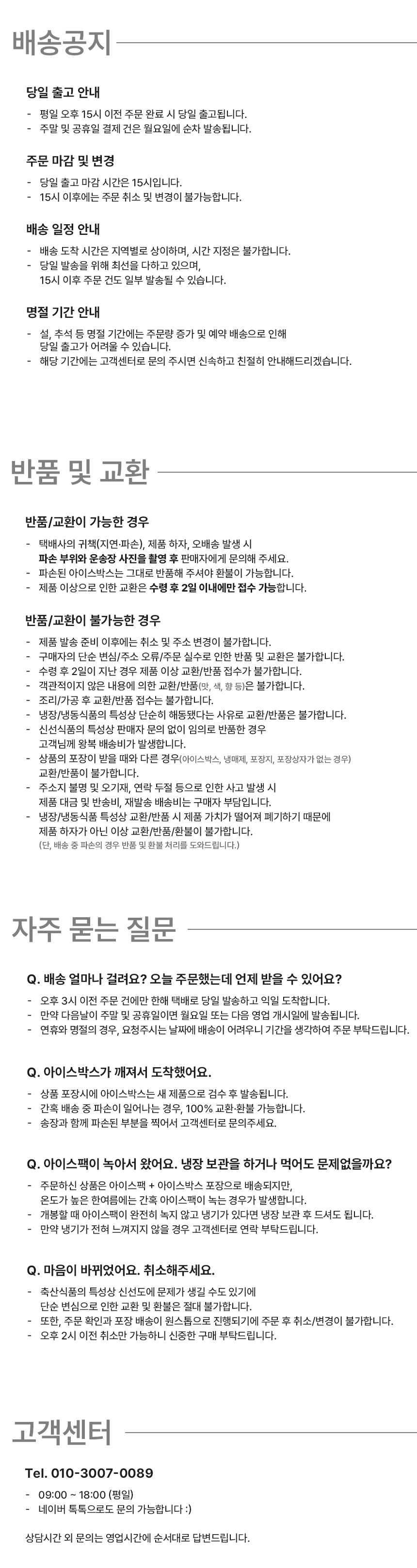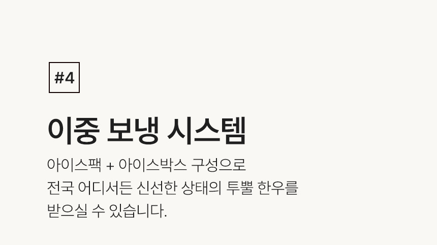 - 구매하시는 제품이 냉동제품인지 냉장제품인지 꼭 확인해보시기 바랍니다. 기본 아이스팩은 내용량에 따라 1-2개 입니다. 택배 배송은 상온에서 이루어 지기 때문에 하절기나 택배 배송상황(지역별 배송시간/날씨 등)에 따라 해동의 정도가 다를 수 있으며, 그로인한 반품 및 교환은 불가한 점 안내드립니다.